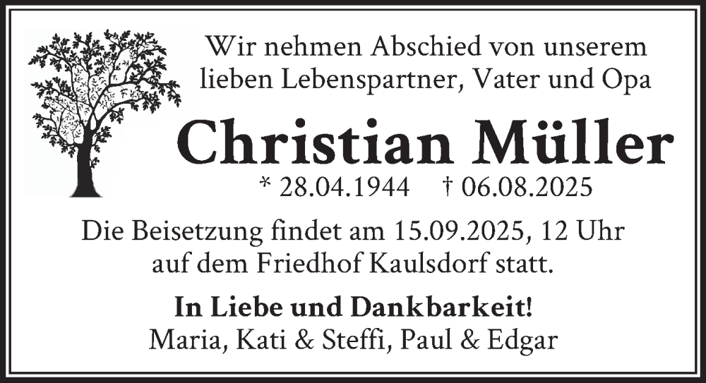 Hier finden Sie alle Traueranzeigen aus der Zeitung, die bisher für Christian Müller erschienen sind. Weitere Traueranzeigen, die in der Zeitung erscheinen, werden hier ebenfalls aufgelistet