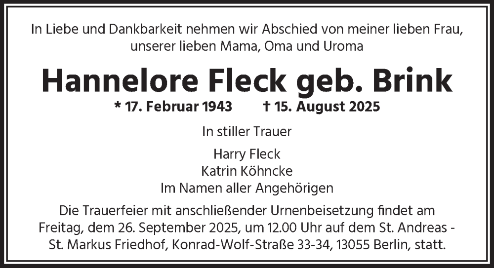 Hier finden Sie alle Traueranzeigen aus der Zeitung, die bisher für Hannelore Fleck erschienen sind. Weitere Traueranzeigen, die in der Zeitung erscheinen, werden hier ebenfalls aufgelistet