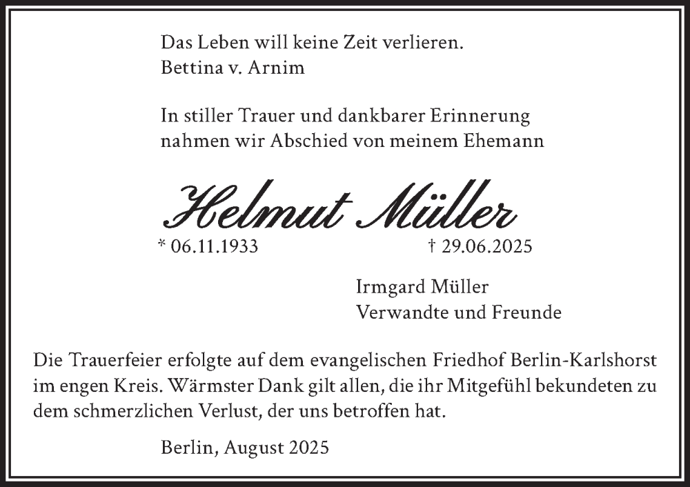 Hier finden Sie alle Traueranzeigen aus der Zeitung, die bisher für Helmut Müller erschienen sind. Weitere Traueranzeigen, die in der Zeitung erscheinen, werden hier ebenfalls aufgelistet